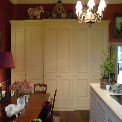 Darren was commissioned by a local Interior Designer to add and make new items to a local National Trust Property in Hampshire, They bay window Sink and cabinets was a new addition and the cooker island was rebuilt to allow for modern appliances and a new radiator in the rear of the island was a new feature to the Kitchen. The large freestanding larder was extended in width which had to have traditional mouldings hand copied to match.