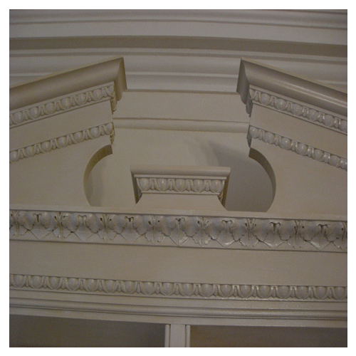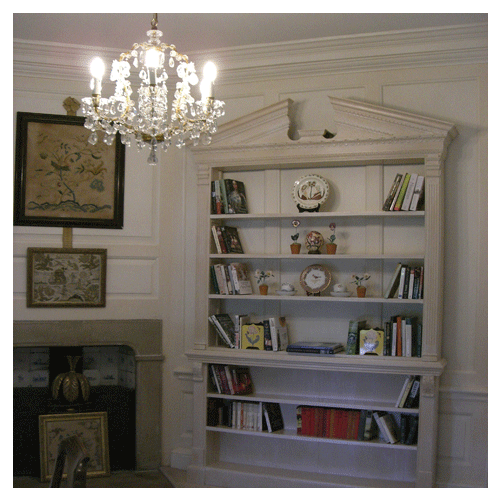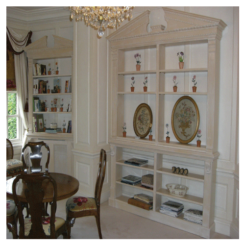 Darren was commissioned by a local Interior Designer to make new items to a local National Trust Property in Hampshire, In this room there was an existing bookcase that was used as a guide to make a double bookcase and a pair of single bookcase that also covered a pair of small radiators beside the windows. The Bookcase were made of hardwood and then painted by hand and aged to match the original bookcase.